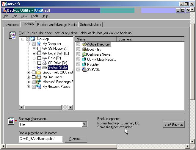 As in the example above, highlight and click "System State" You will see that Active Directory is more than one part, it is also the system state, boot files, registry etc (Maybe you now understand why I say have fun if you haven't made the backup prior to the crash. Depending on the number of servers, it may be easier to rebuild than try and join up again, especially if your Exchange is also split across servers). Click "Start Backup" and in my case, it took about 0.6Gb space for 15 users.