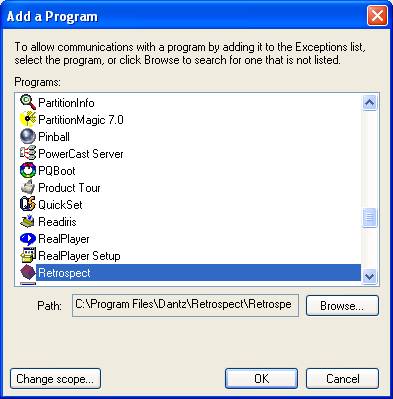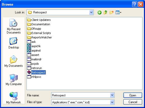 Navigate down to Retrospect (or Dantz Retrospect) -they are in alphabetic order- click on it to highlight it and click the OK button. If your Retrsopect is recently installed and hasn't been started up yet (like mine), it may not show in the list. In this case, click on the Browse button, and you get something like this: